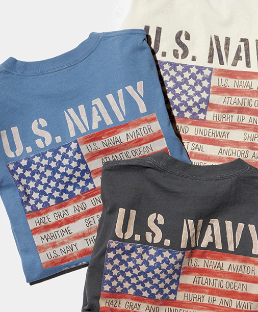 フロリダのメイポート海軍補給基地のステンシル風プリント、星条旗をモチーフにしたレタードテイストのアートワークが特徴。